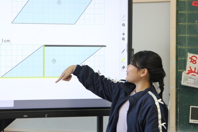 この時間の課題は、「平行四辺形の面積はどのようにしたら求められるか」です。