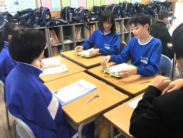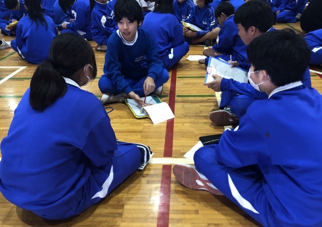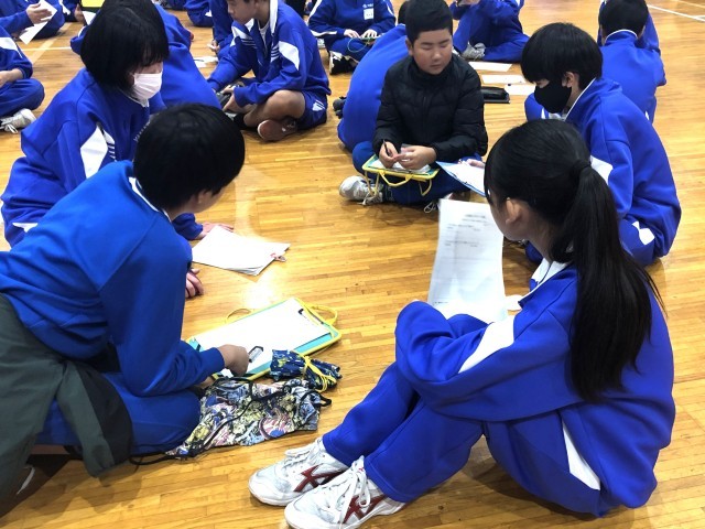 小6、中1,中2、中3のメンバーで構成された90の班に分かれ、提示された状況について、いじめにあたるのか、いじめにならないためにどのように行動したらよいかについて意見交換をしました。