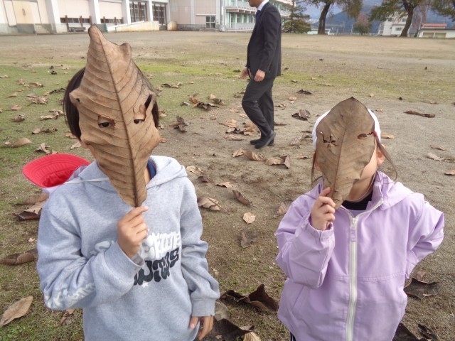 校庭にある木々の葉っぱが地面を覆うように落ちていて、遊ぶには恰好の材料です。