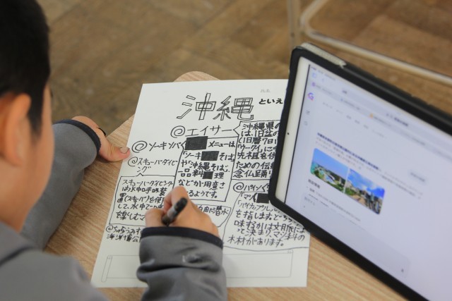 この時間は、47の都道府県からおすすめを一つ選び、そのよさを紹介するポスターをつくる活動を行いました。
