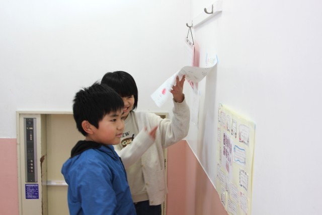 見つけた文字には番号が付いていて、体育館に戻った後に、その番号順に文字を並べて貼っていきました。