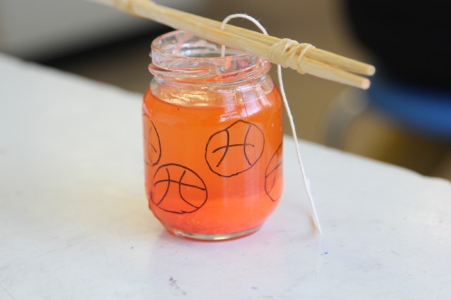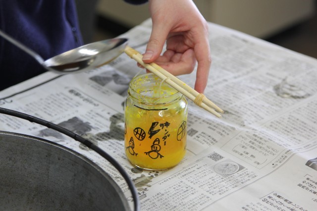 さらに、キャンドルの芯になるタコ糸を瓶の中心に固定しながら廃油を足していきます。