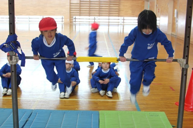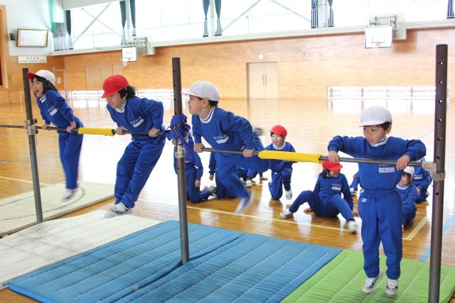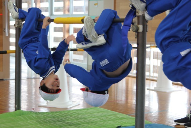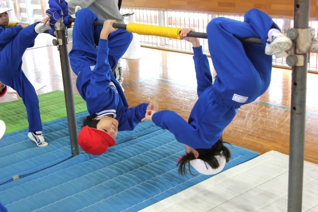 後半は、ぶら下がって向き合い、ジャンケンをする技にも挑戦。