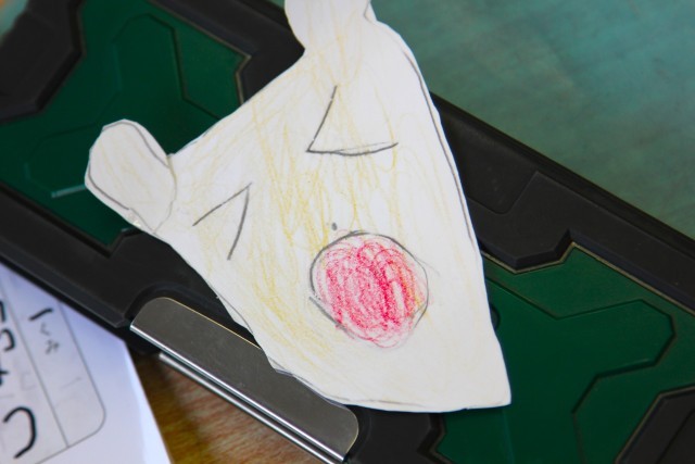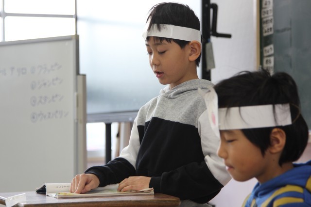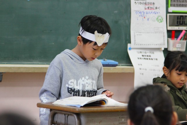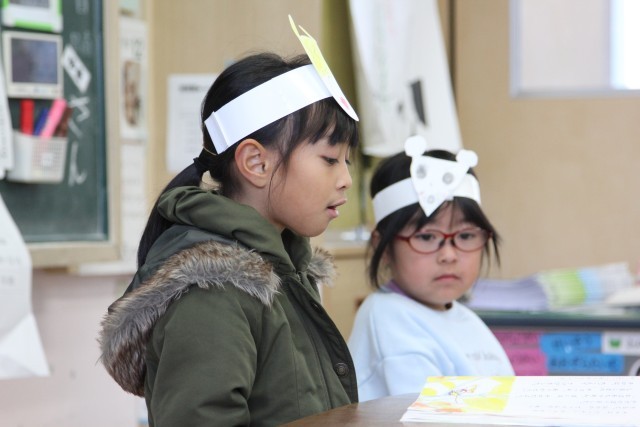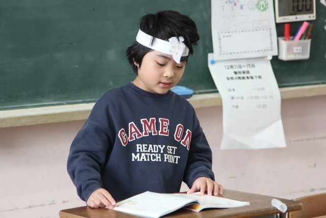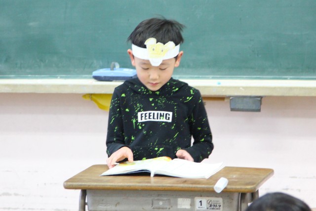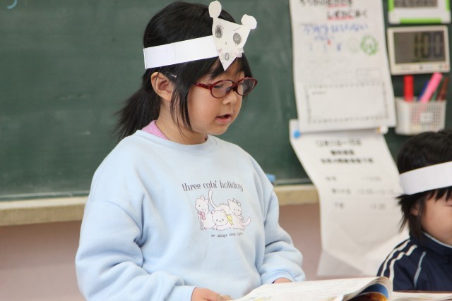 自分が描いたチロを頭に付けて、音読発表会を行いました。