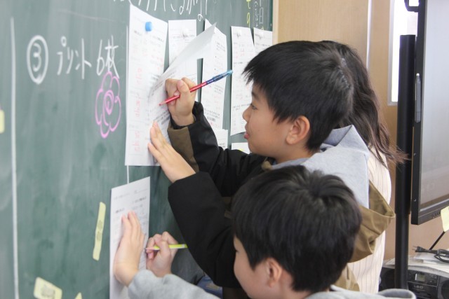 プリント問題が解けたら、黒板に貼ってある答えで丸つけをします。