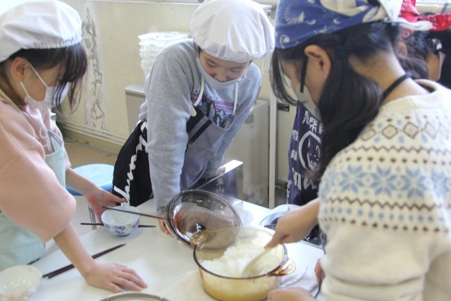 今日炊いたお米は、自分たちが学校田で栽培、収穫したものです。