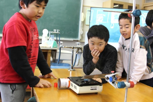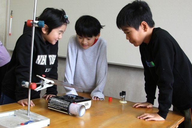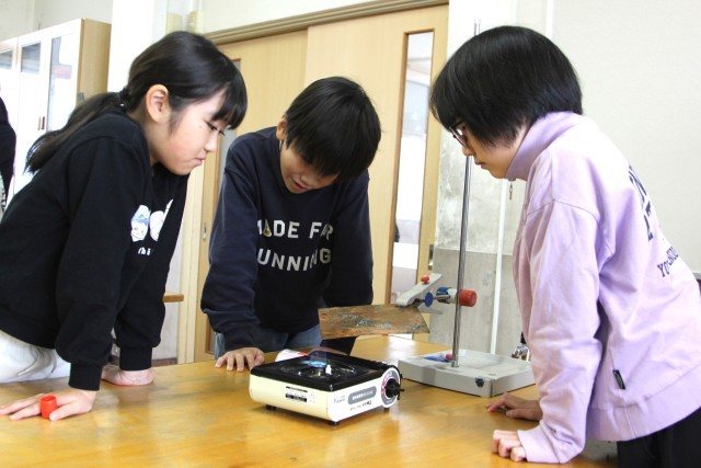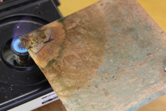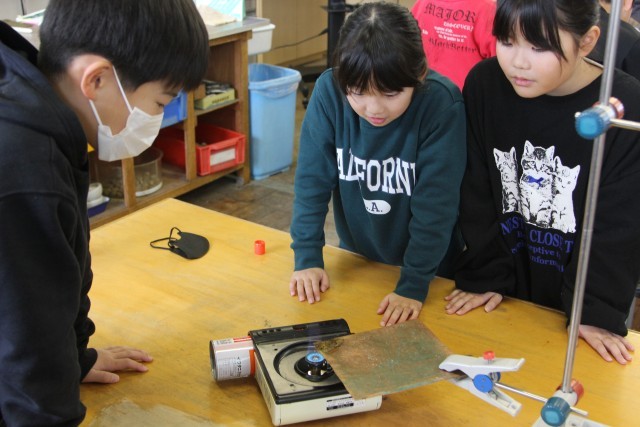 前時に立てていた予想を確認した後、実験用コンロで銅板を熱します。