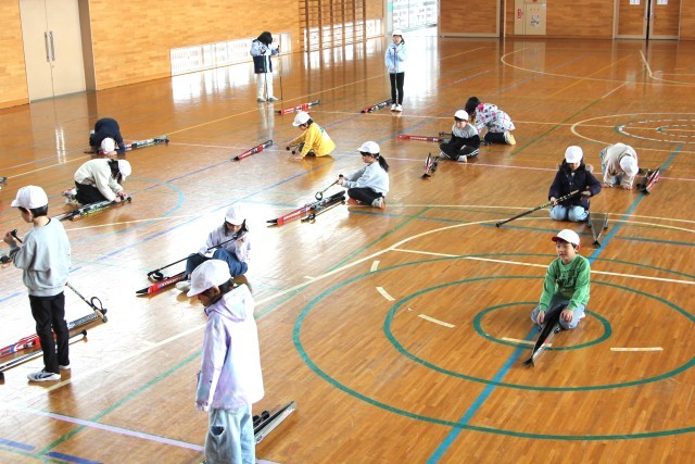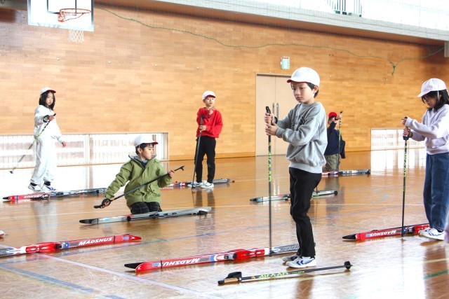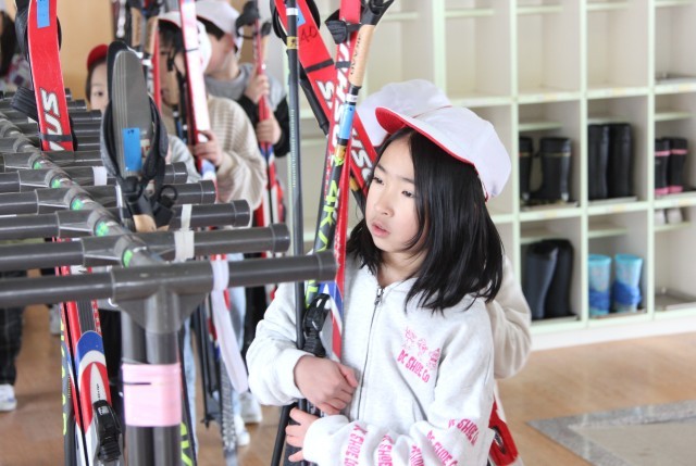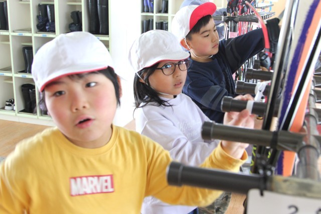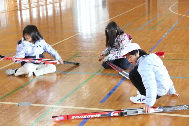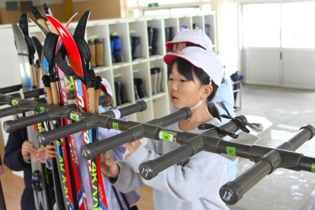 2年生は、自分に合ったスキー板とストックを準備する活動を行いました。