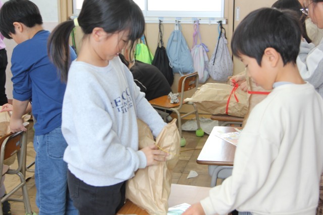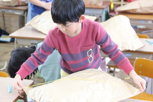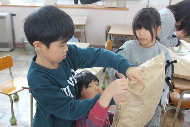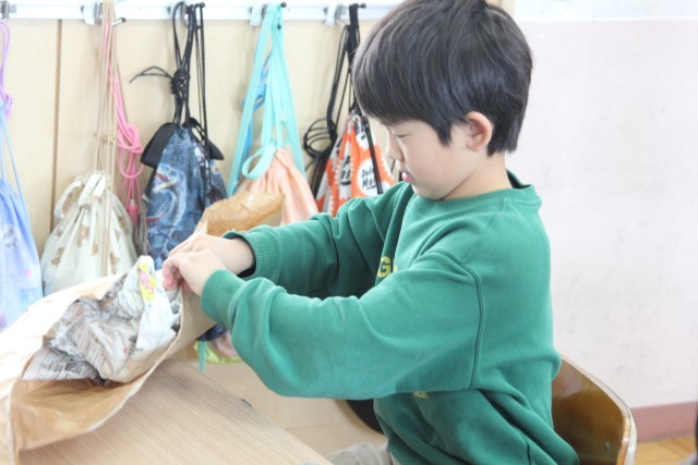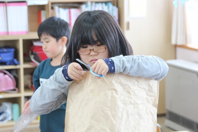 袋を分解してつなぎ合わせ、長細くする子もいます。