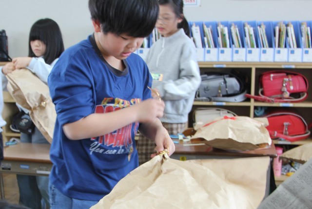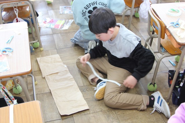 大きな袋に新聞紙を入れて閉じ、それをひもでしばったり、飾りをつけたりして作品をつくる活動です。