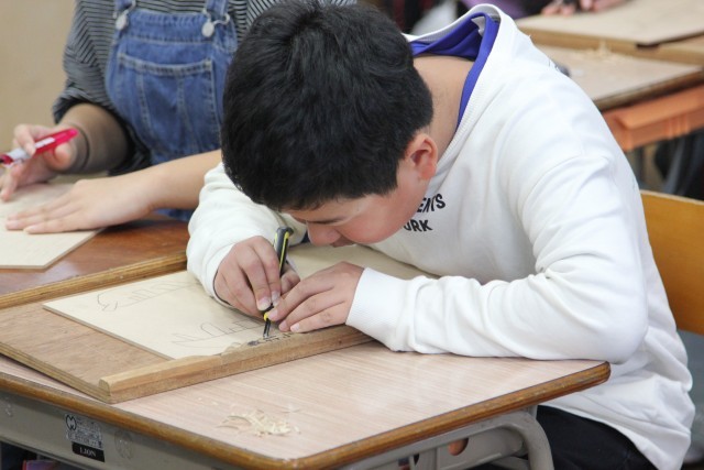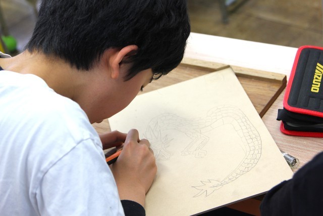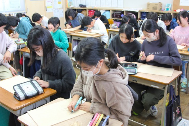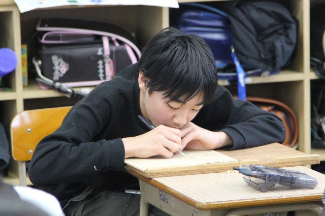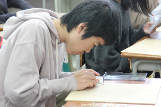 子どもたちは、できあがりをイメージし彫り方を考えながら彫り進めていました。
