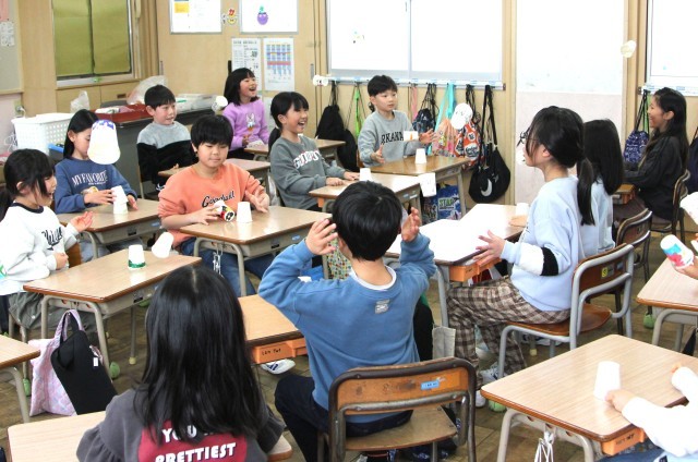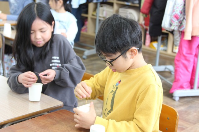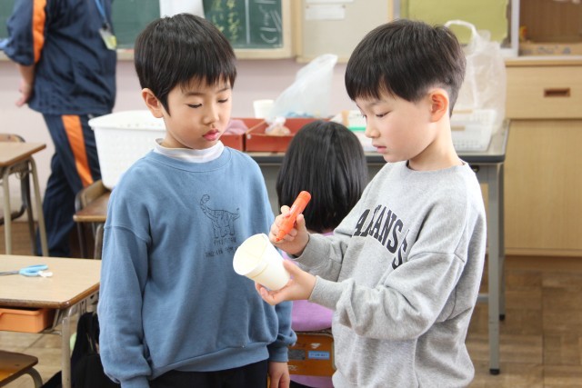 紙コップと輪ゴムを使って、動くおもちゃをつくる活動です。
