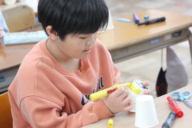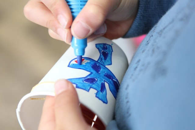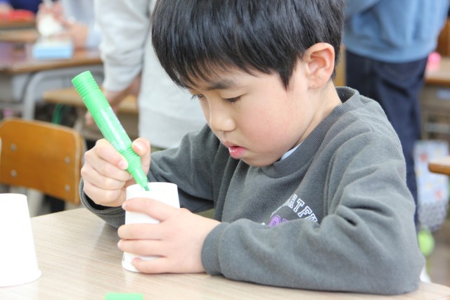 紙コップは思い思いにデザインをし、自分だけのオリジナル「ぴょんコップ」の完成です。