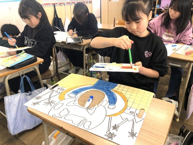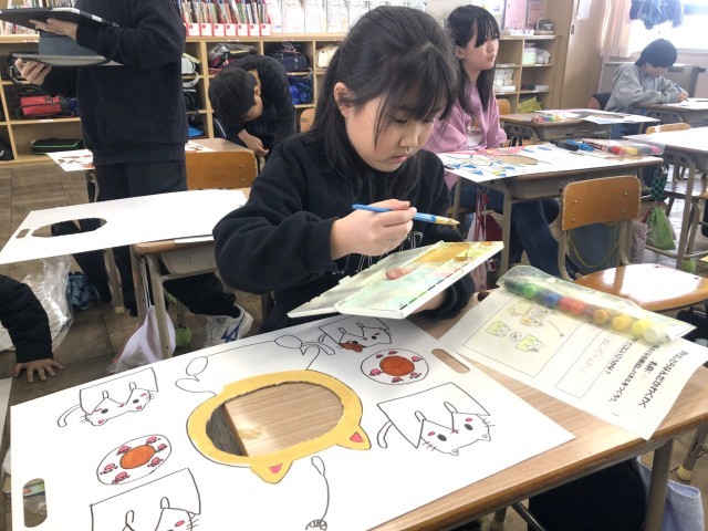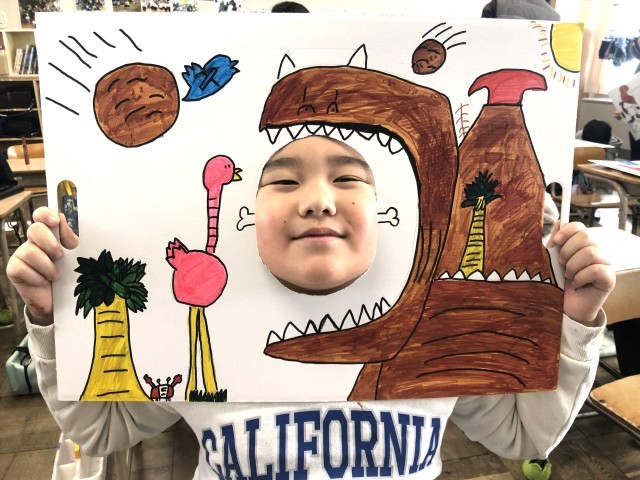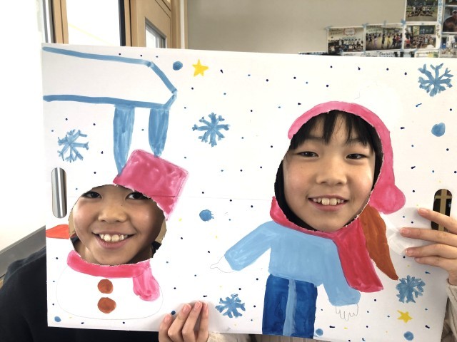 二つ穴をあけて、友だちと一緒に顔出しできる作品にした子もいました。