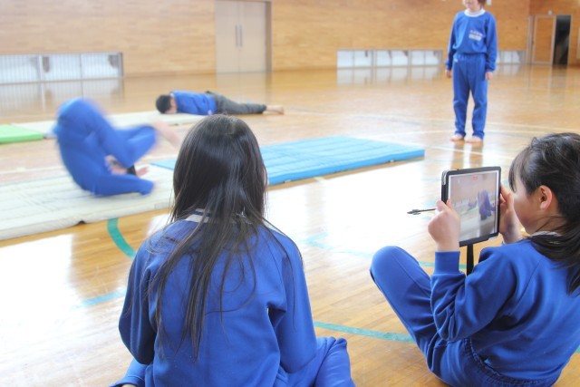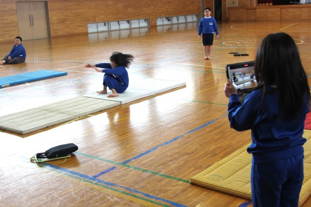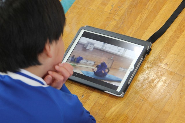 子どもは、タブレット端末で、自分が前転する様子を友だちに撮影してもらっていました。