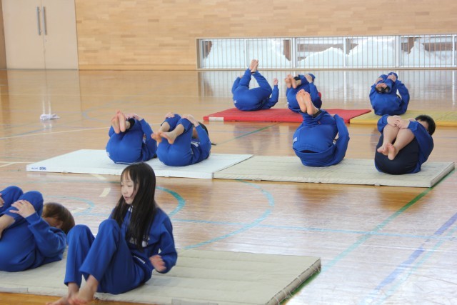 体を温めた後は、前転の練習です。