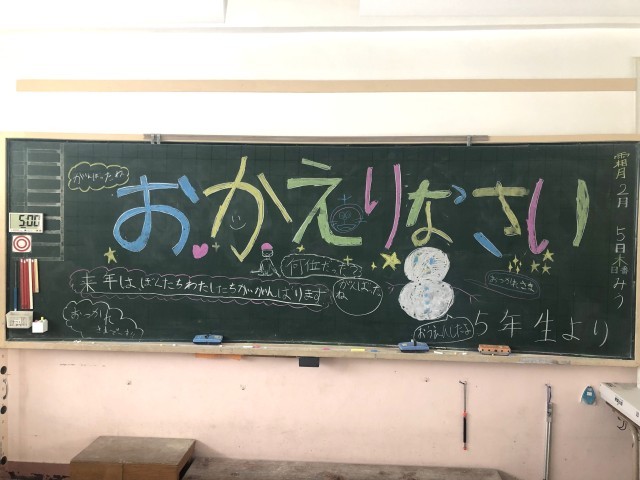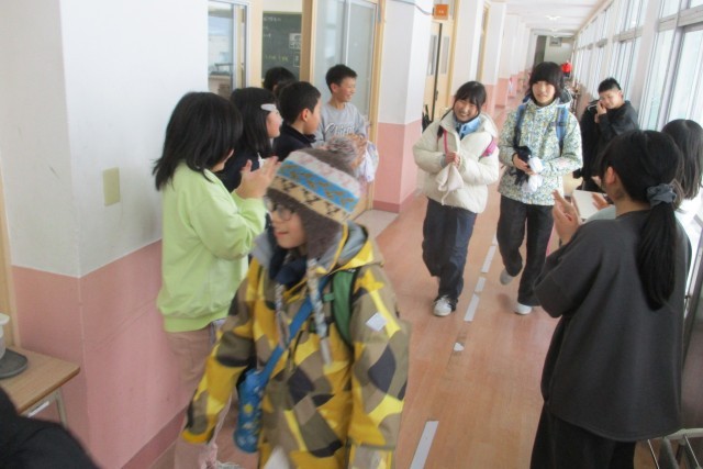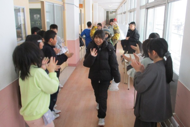 学校に戻ると、5年生が「お疲れ様!」とあたたかく迎えていました。