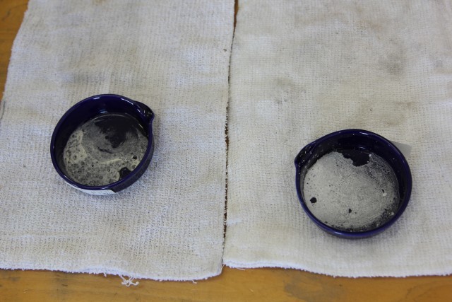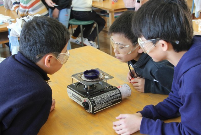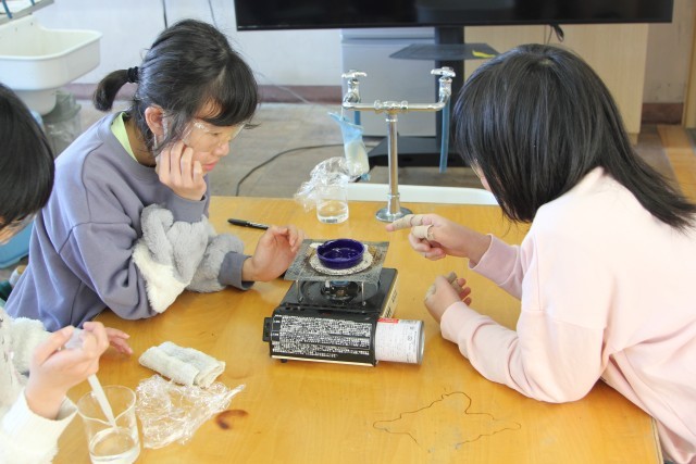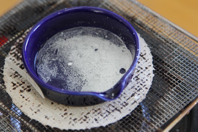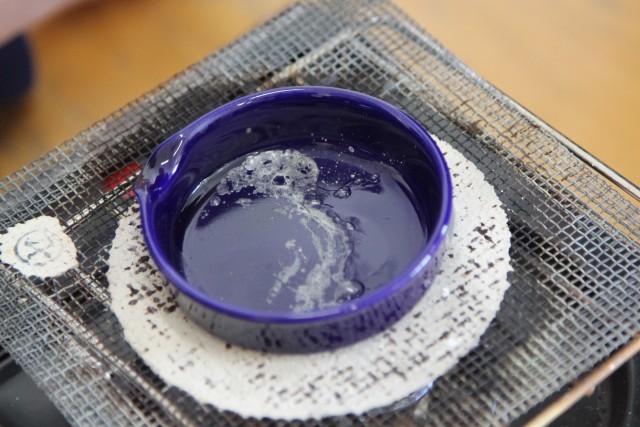 蒸発皿に水溶液をたらし、加熱をします。
