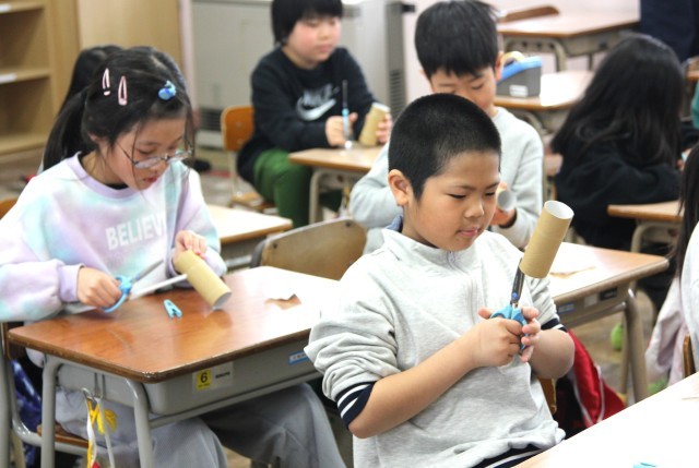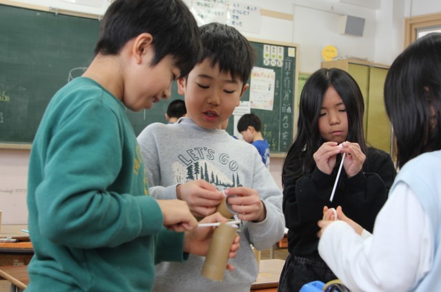 この時間は、トイレットペーパーの芯とストロー、輪ゴムとティッシュペーパーを材料に、まと当てをつくりました。