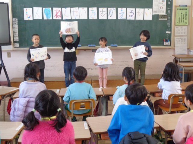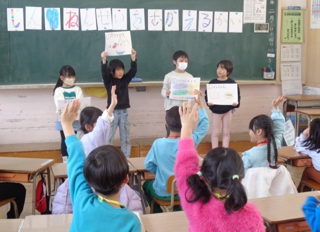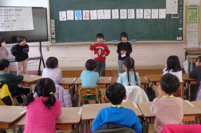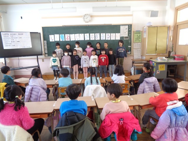 子どもたちは、校歌を披露したり、学校クイズを出したり、校舎案内をしたりすることで、小学校と園の違いを伝えていました。