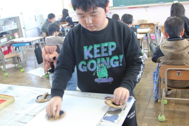 インクを紙にのせるよう、バレンで丁寧にこすった後に刷り上がりを確かめます。
