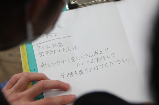ある委員会では、オブザーバー席に移動した6年生が、5年生・4年生へメッセージを書いていました。