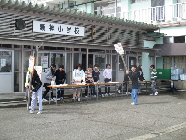 5年生は、来校する保護者が必ず通る玄関前に販売ブースを設定しました。