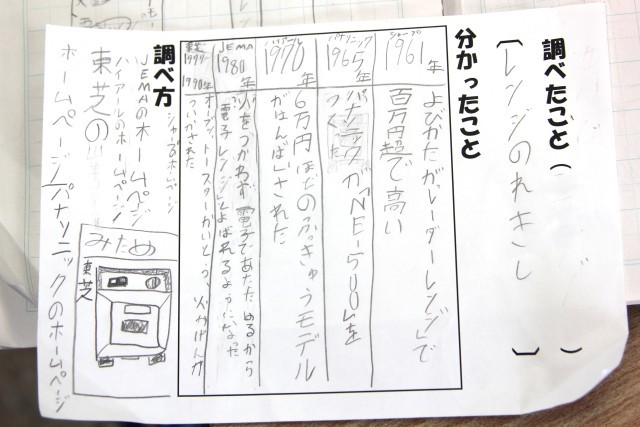 子どもは、電子レンジやストーブ、お風呂など、興味をもったことについて、時代でどのように変化してきたのかを調べました。