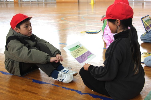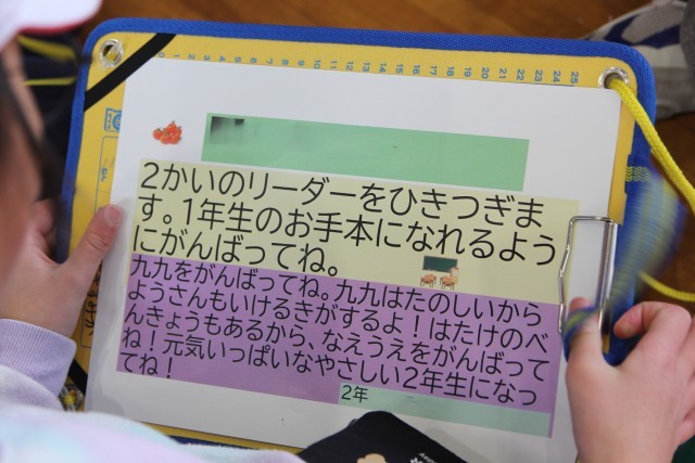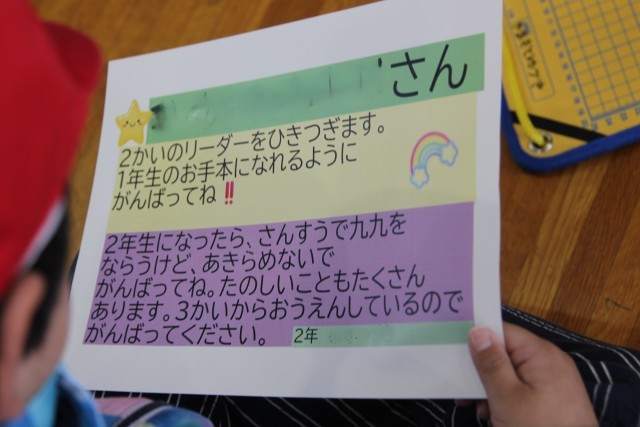 最後は、まほろば班ごとに、2年生から1年生へ「引き継ぎメッセージカード」を渡します。