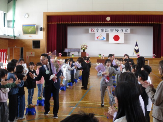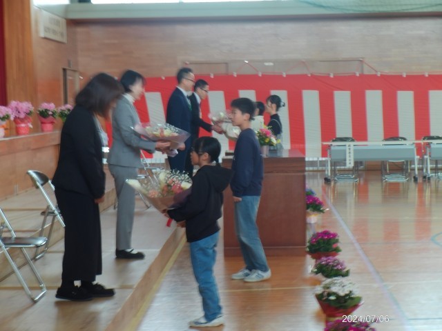 離任式では、代表児童からのメッセージと花束が贈られ、新任地に向かう先生方へ感謝の気持ちが伝えられました。