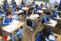 1限、1-1は算数「学年のまとめ」。正確さとスピードの両方を身に付けるため、復習プリント1枚を5分の時間制限をかけて解答しました。集中していました。