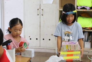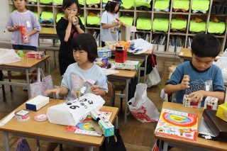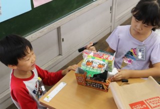 算数の時間に使った箱を使い、図工の時間に工作を楽しみました。
