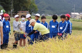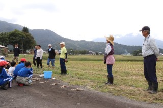 講師の若井さんから稲刈り鎌の使い方や刈った稲の束ね方などを教えていただいたあと、二人一組で稲刈りを始めました。