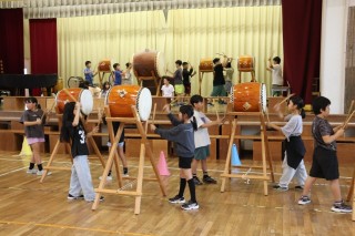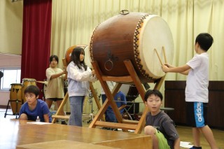 5限、3-1は総合、清水先生を迎えて太鼓の練習をしました。