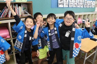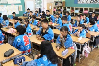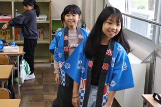 法被をもらい、大喜びの4年生です。本番へ向けて気持ちが高まりました。
