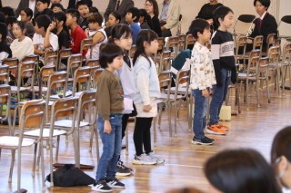 「音楽のおくりもの」を歌いました。1~4年生と5・6年生のパートに分かれ、きれいなハーモニーを響かせました。