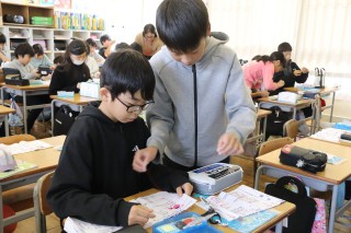 一人で挑戦する児童、友だちの力を借りながら挑戦する児童、様々でしたが玉結びと玉留めにゆっくり、じっくり取り組みました。