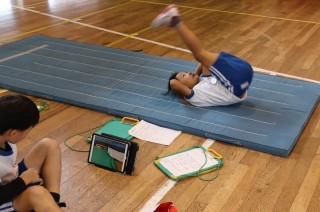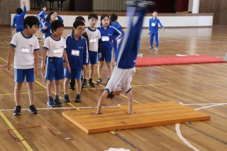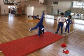 前転、後転、側方倒立回転、三点倒立などの技に挑戦しました。