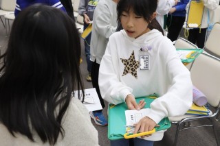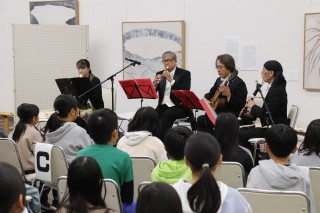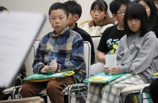 八海中学校区3小学校の4年生が集まり、グループABの演奏を聴きながら交流しました。