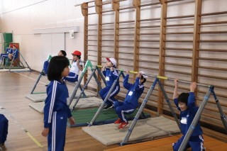 ぶら下がりタイムアタックや地球回りなど、自分の体(体重)を腕や足で支える運動に取り組みました。