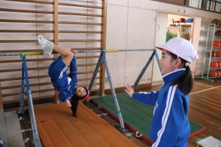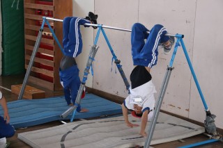 地球まわりや足抜きまわり、逆上がりなどの回る技やぶたの丸焼きやぶら下がりなど体重を支えながらぶら下がる技などに挑戦しました。