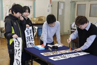 地域の書き初めの先生を講師に迎え、文字のバランスや太さなどの指導を受けました。