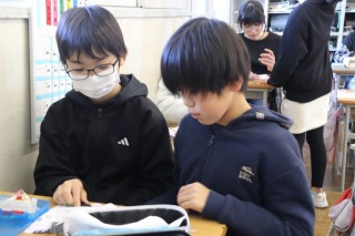 今日は練習用布の完成提出日です。友だちに教えてもらったり、一人でがんばったりしながら、練習用布にあるボタン付け、なみ縫い、返し縫いなどに取り組みました。