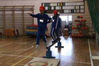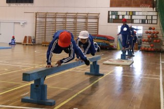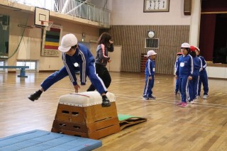 1限、2-1は体育で跳び箱、平均台あそびをしました。