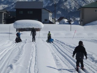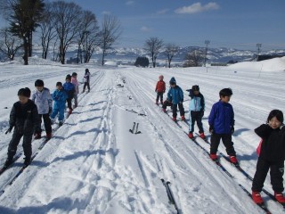 児童は青空の下、気持ちよく初滑りを楽しみました。
