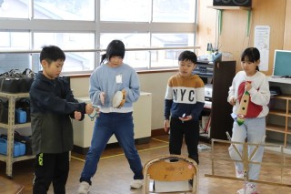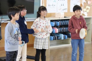 タンバリンやカスタネット、トライアングルなどの楽器を使い、グループでリズムに合わせて作曲したクロックミュージックを発表しました。