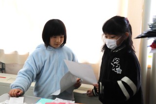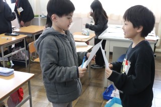 「What color do you like? 」「I like ○○.」とインタビューし合いながら、友だちの好きな色を聞きました。