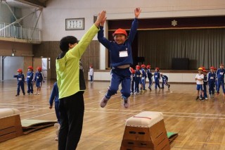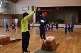 少しでも高くジャンプしようと、助走の勢いのまま跳び箱に上がったり、腕を高く上げて伸ばしたりしながら跳び箱遊びを楽しみました。