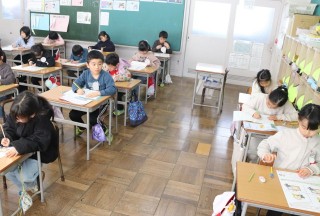 1限、1-1は算数「なんじなんぷん」。