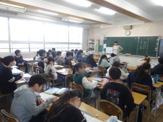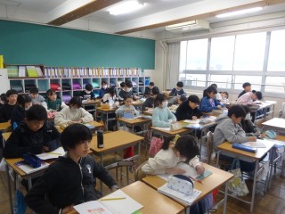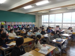 1限、6-1は国語「修学旅行は何のためにある」。・思い出を作る。・佐渡の歴史文化を学ぶ。・楽しむ。・カニを食べる。いろいろな考えが出ていました。正解ではなく、納得解を学ぶための学習でした。子どもたちの納得解は何だったのでしょうか。楽しい雰囲気で学習に取り組んでいました。
